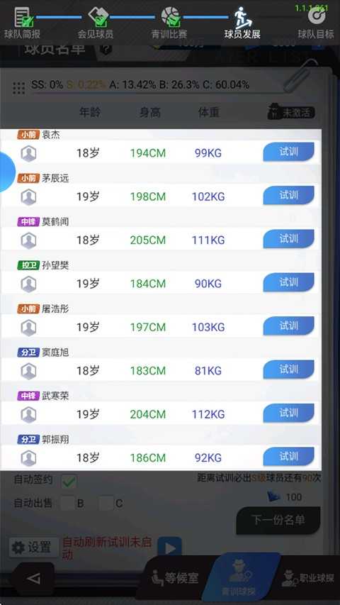 球員被劃分為S、A、B、C四個等級,等級越高意味著成長上限越高,潛力也更值得期待。不同年齡段會對最終發(fā)展產(chǎn)生影響。每次球探任務會給出8個候選新人,但只能選擇其中一位進行試訓。首次刷新候選名單是免費的,之后每次刷新需要花費100鉆石,單次試訓則需要150鉆石(開通高級顧問后可享受最高8.5折的優(yōu)惠)。