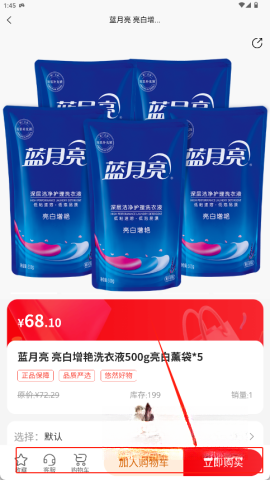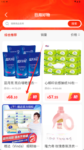在商品列表里找到你心儀的產(chǎn)品,像“藍(lán)月亮洗衣液”這類,接著點(diǎn)擊“搶”按鈕就可以了。