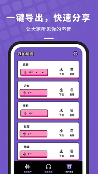 音頻庫中的變聲音頻與原音頻,都支持一鍵便捷保存,操作簡單高效;此外,還能把“我的創作”板塊里的音頻一鍵分享給好友。
