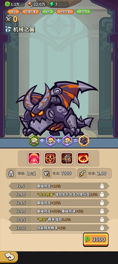 注意!(帶有控制技能的英雄盡量別放在門口,建議安排在1-3/1-4位置),避免BOSS卡在門口而錯失最佳擊殺時機。另外要注意,這個游戲無法疊傷,因此機械之翼不像領主玩法里的龍那樣可以多做幾個來疊加傷害。