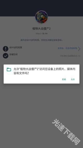 打開游戲安裝包,在彈出的權(quán)限請(qǐng)求中允許“植物大戰(zhàn)僵尸2”訪問設(shè)備的照片、媒體及文件,隨后游戲?qū)⒆詣?dòng)開始解壓并完成安裝流程。
