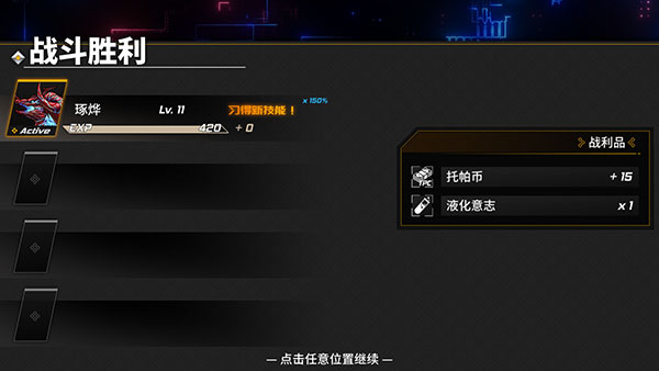 在擊敗敵方角色后,我方即可取得戰斗勝利,屆時結算界面會呈現我方角色所獲的經驗值以及戰利品信息。