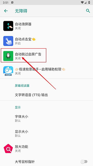若想使用該功能,需前往輔助功能頁面開啟[自動跳過啟屏廣告]服務。