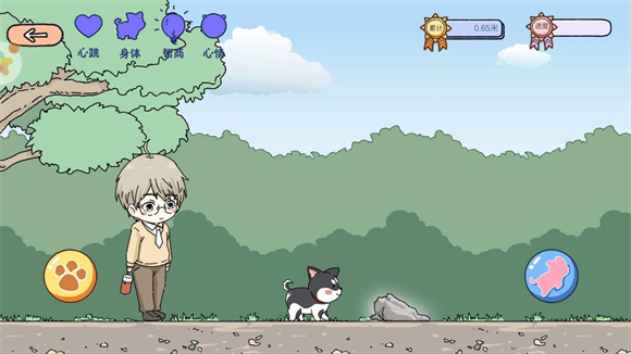 在地圖場景里,你能碰到像寵物醫院、城堡、水果屋這類不同的地點。點擊進入這些地點后,屏幕上會彈出一組卡牌。每張卡牌都會對心跳、身體狀況、智力水平和情緒狀態這四個數值帶來一定的影響。一旦這四個數值中的任何一個下降到了最低值,遛狗的活動就會隨之結束。