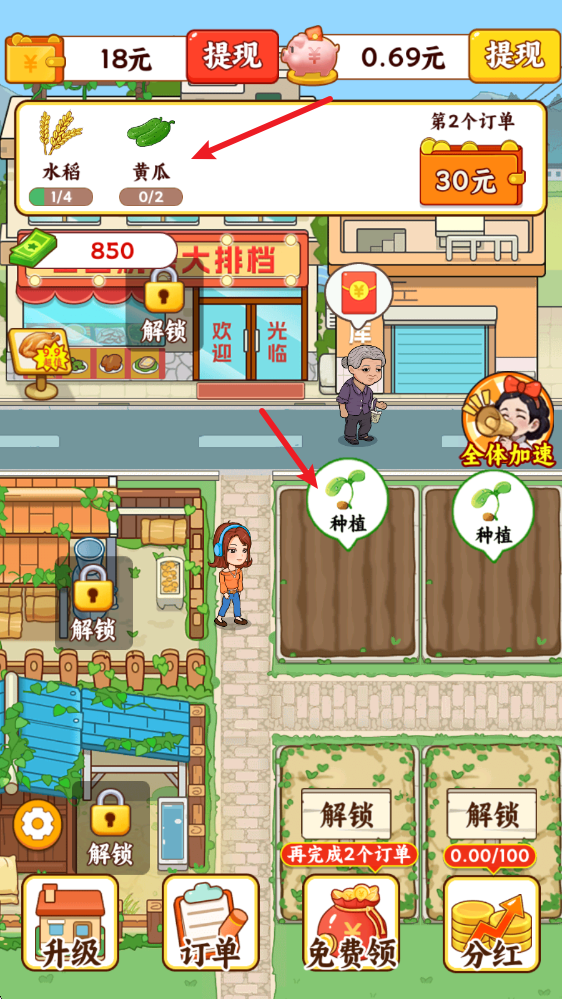 進入游戲后,我們能在上方看到自己的訂單信息,接著點擊空地就可以開始種植了。