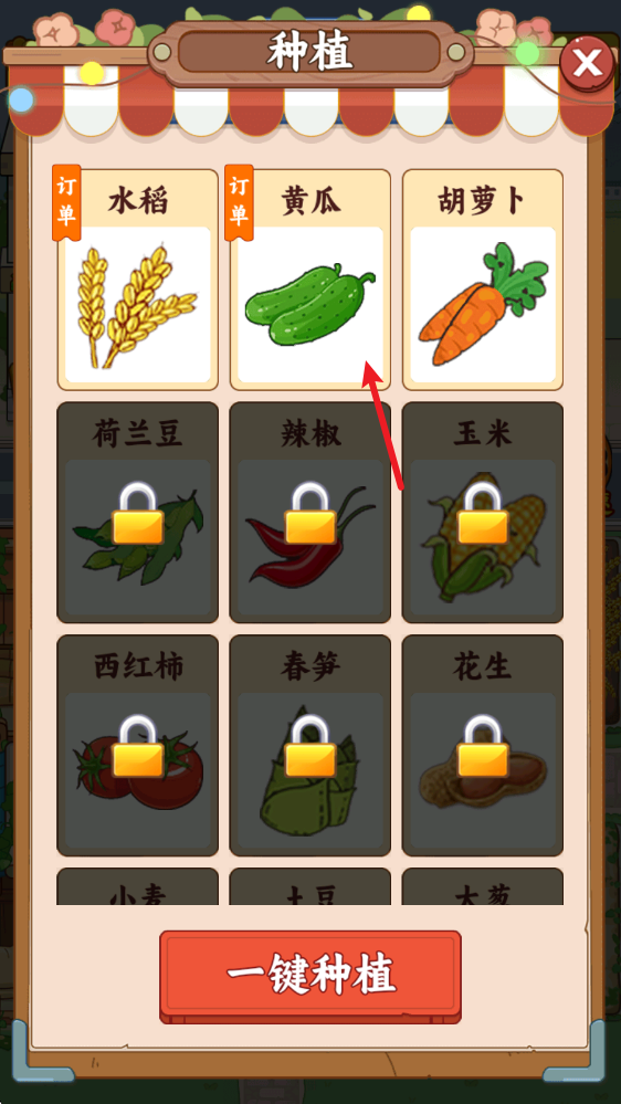 打開種植界面后,我們只需選擇帶有訂單標識的作物進行種植就行,也能點擊一鍵種植功能。