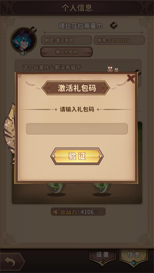 兌換方法:先在界面左上角點擊頭像,接著找到輸入禮包碼的選項并點擊,把禮包碼填入兌換框后點擊兌換按鈕,之后就能去郵箱領取獎勵了。