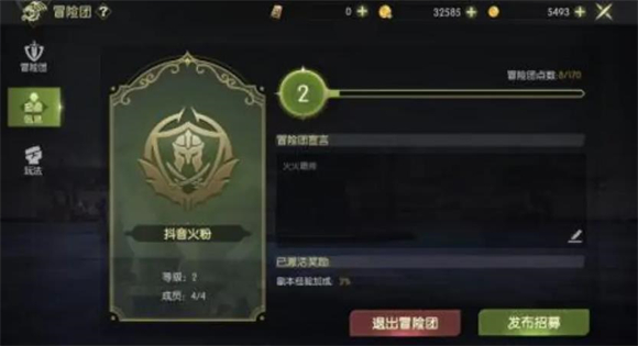 5級開放交易所、副本、裝備強化!!強化到6的裝備,分解柏林套裝時會返還所有強化消耗的強化石,重點說下冒險團:點擊菜單選擇冒險團即可打開,加入后能獲得3%經驗加成,對前期升級幫助不小。冒險團有四個成員位置,你可以提前找好伙伴,也能隨意加入,只要成功加入或創建就能享受經驗加成。