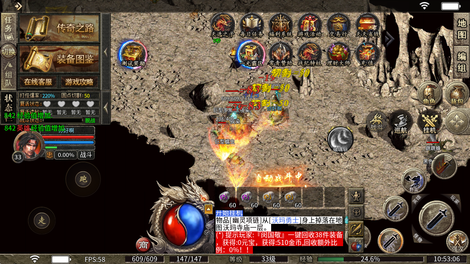 先把下圖里的自動回血功能調(diào)試好,接著去擊殺小怪獲取一些初級裝備,之后再去挑戰(zhàn)高級BOSS!