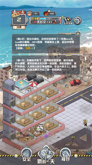 距離結束還剩兩天時,要是計劃還沒完成,那就賣掉背包來湊夠剛好達標的數值。畢竟可能會碰到一些突發狀況,比如當天需要清理喪尸,導致生產收益為0——這種情況下哪怕你只差一點點,背包存量也不少,最終還是會游戲結束。