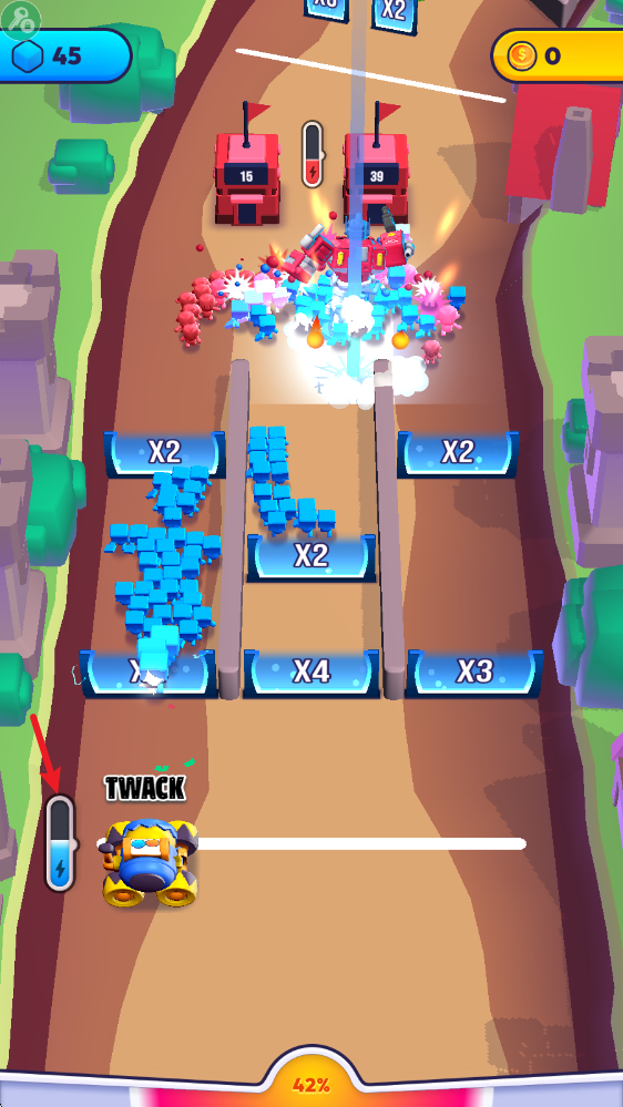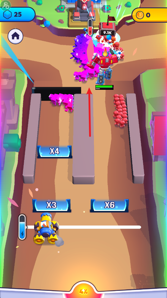 除此之外,擊敗敵人還能積累大招能量,等能量攢滿后點擊就能釋放,就像這里,能把我們的小兵變成無敵的彩虹人。