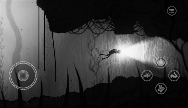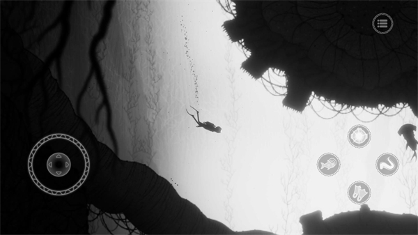 游戲營造的氛圍相當(dāng)出色,可供探索的區(qū)域也頗為豐富,操作方式簡單易懂。這款游戲并未采用互動(dòng)性更強(qiáng)的三維場(chǎng)景,也沒有運(yùn)用高端開發(fā)引擎去打造逼真的3D畫面,而是選擇了簡約樸素的二維場(chǎng)景,以及類似鉛筆畫風(fēng)格的手繪式畫面。不過,這絲毫沒有削弱游戲的沉浸感,反倒讓這些場(chǎng)景與游戲氛圍形成了完美的呼應(yīng)。當(dāng)黑白的色調(diào)與海底的氛圍相互融合,再搭配上游戲中精心編排的背景音樂,便會(huì)為玩家?guī)硪环N冰冷、死寂、毫無生機(jī)的死亡之地的體驗(yàn)。