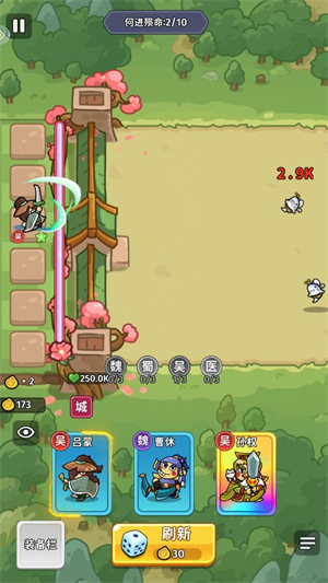 進入關卡后,點擊刷新按鈕即可召喚武將來參與戰斗,每次刷新都會隨機出現三個武將,你需要從中挑選一個。