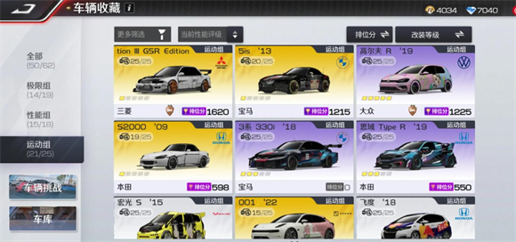 性能分組: 金色車輛:蘭博基尼蓋拉多;路特斯(可免費獲取圖紙) 紫色車輛:GTR、斯巴魯、三菱、領克03(僅素車跑分,無需培養)、凱迪拉克;福特(可免費獲取圖紙)