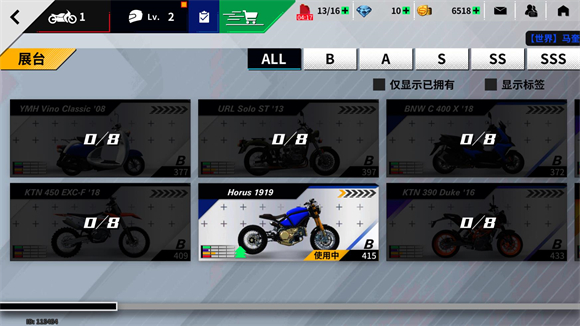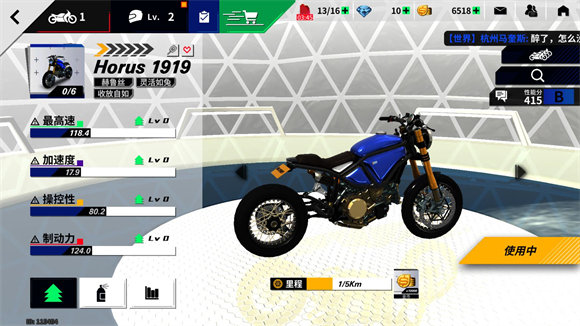 在主界面點擊左上角可以進入車庫查看擁有的摩托。
