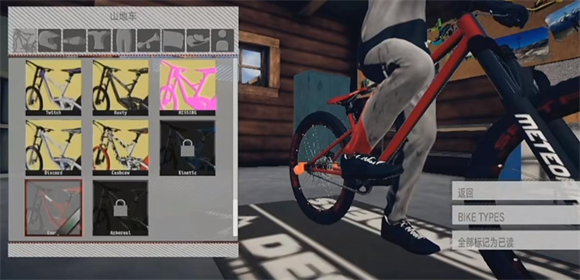 更換皮膚的方法是:在主界面點擊車棚,接著向下滑動選擇不同的山地車,之后點擊想要的皮膚即可完成更換。其他裝備的皮膚更換方式相同,點擊兩次就能完成更換。