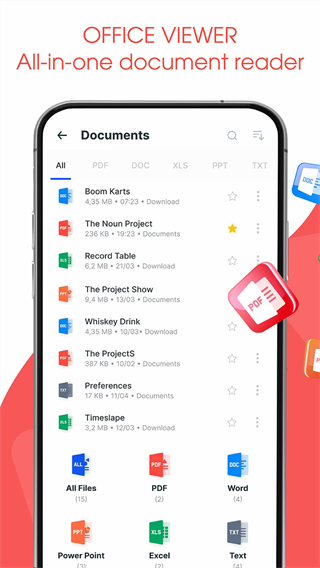 多合一文檔閱讀器支持讀取來自內部存儲、電子郵件、云服務、網頁及外部存儲設備中的PDF、DOC、DOCX、XLS、PPT、TXT等格式文件。
