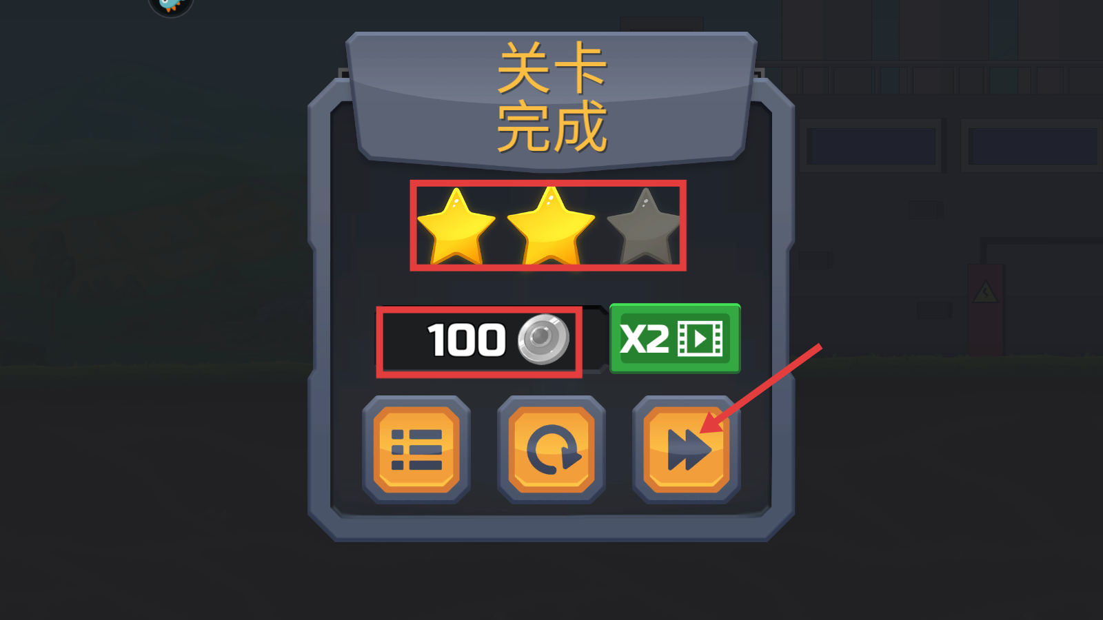 關卡完成后會得到星級評定以及【100】銀幣,點擊箭頭按鈕即可進入下一關,通過積累資源來增強卡車的性能。