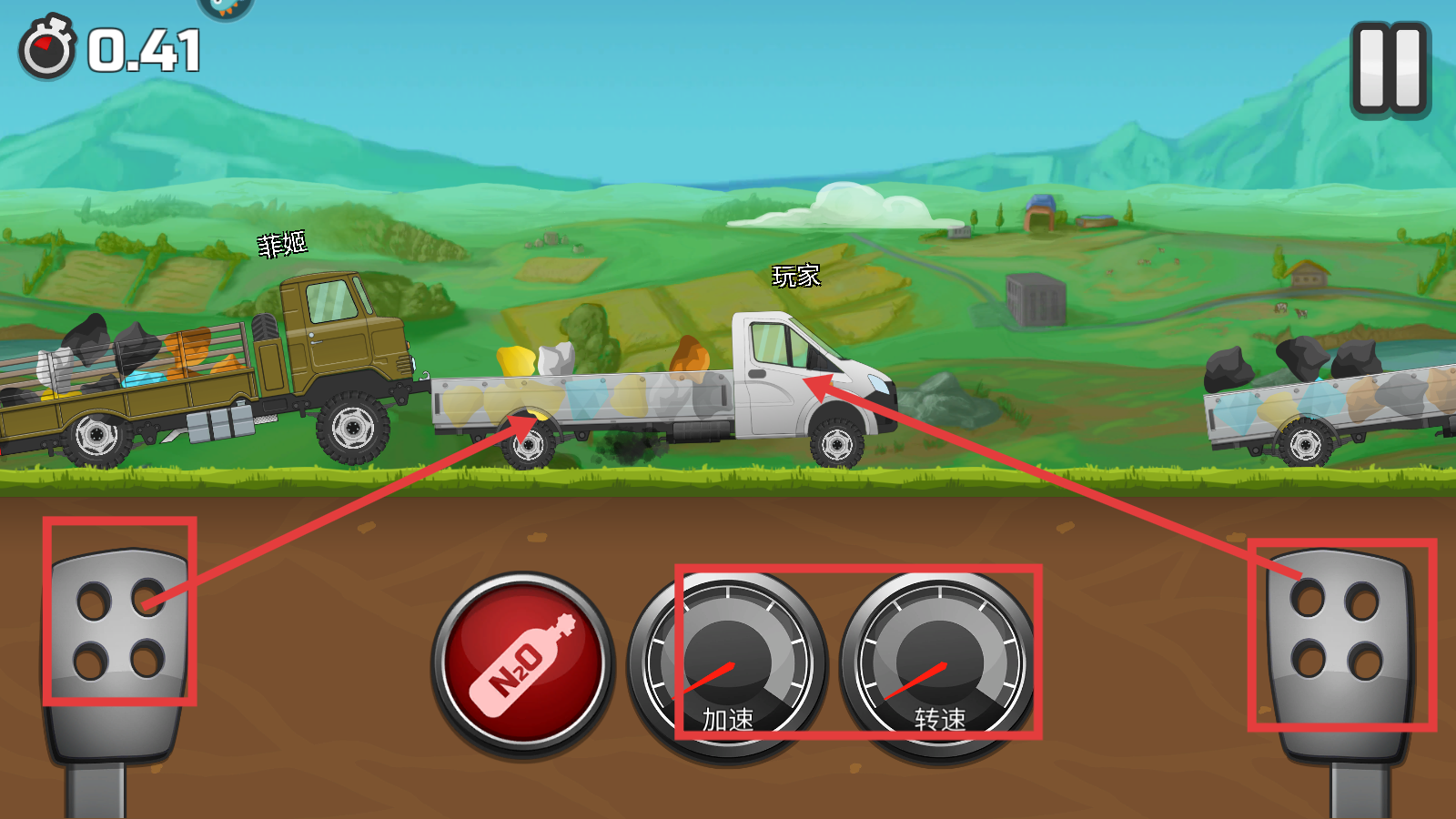 駕駛過程中操控左右兩側的踏板,留意【加速】【轉速】儀表,把控卡車在各類地形里的行駛狀態,和其他車輛展開競速比拼。