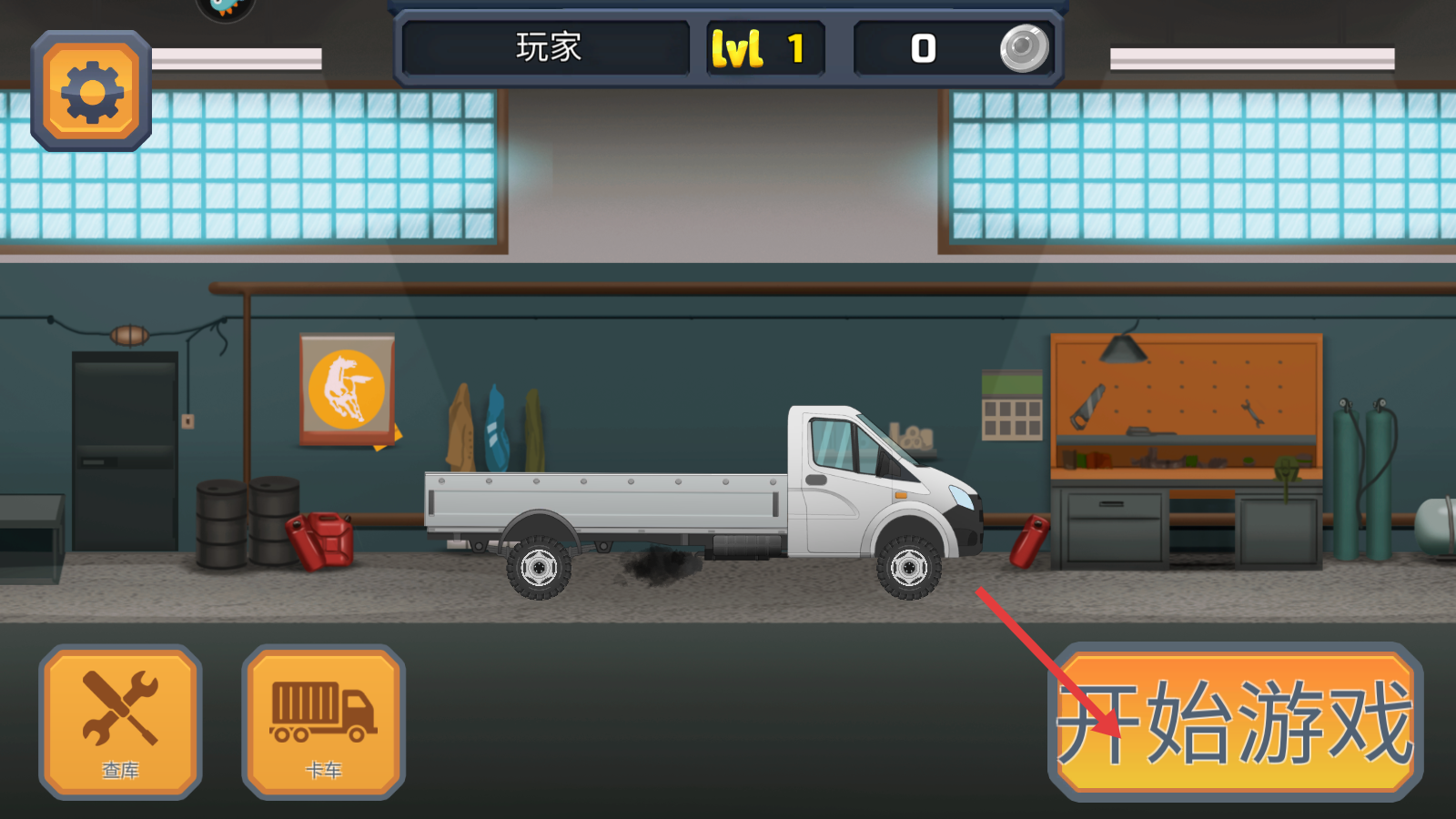 點擊【開始游戲】按鈕進入游戲后,首先要熟悉車庫里的卡車,以及【查庫】和【卡車】這兩個功能按鈕,為接下來的駕駛環節做好準備。