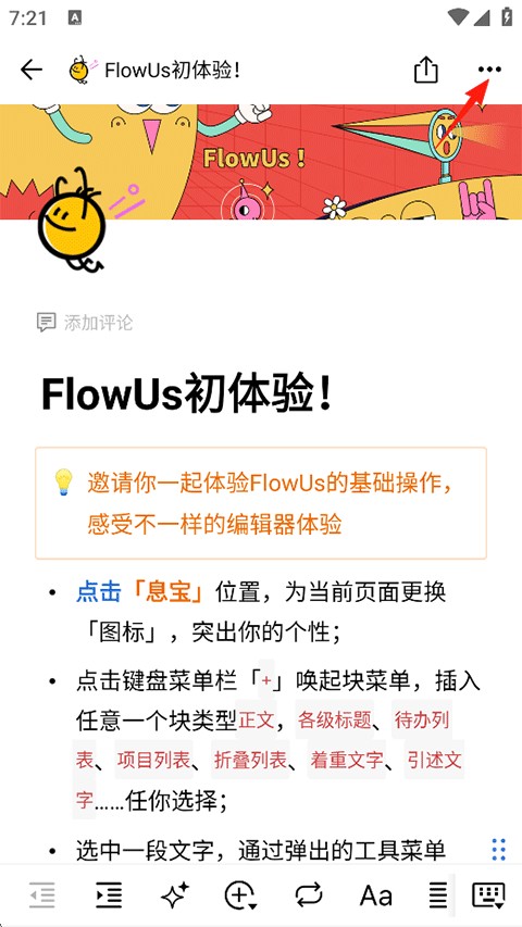 打開FlowUs息流正版,選擇一個需要導(dǎo)出的頁面文檔并點擊右上角的...擴展按鈕;