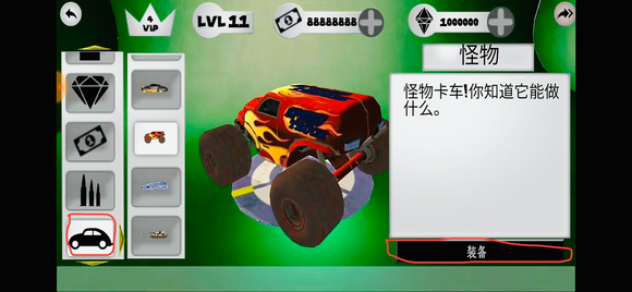 步驟二:拉動最左列圖標找到“汽車類”,挑選自己喜歡的車型,點擊右下角的“裝備”(我們以怪物車為例)。