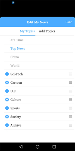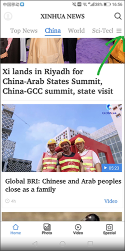 打開Xinhua News ,進(jìn)入Home頁(yè)面,點(diǎn)擊右上角的類似三字型的圖標(biāo)(下圖綠色箭頭所指的位置)