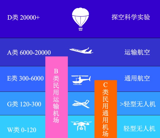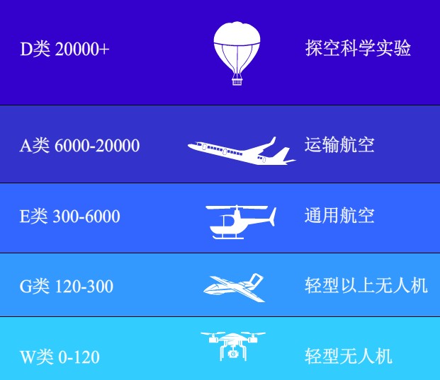 G類 真高120-300米多用于電動(dòng)垂直起降航空器(eVTOL)、物流、巡檢等行業(yè)類無人機(jī)飛行。