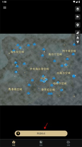 在首頁界面就是各個地圖的標記,然后點擊下方的篩選標點
