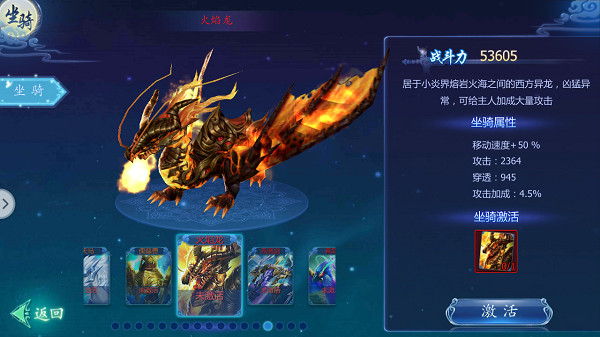 棲息在小炎界熔巖深處的西方異龍,性情兇猛暴戾,能為主人帶來高額攻擊加成。其屬性加成包括:移動速度提升50%、攻擊增加2364點、穿透增加945點,以及4.5%的攻擊加成。想要獲得它,可通過參與【裝備尋寶】活動獲取。