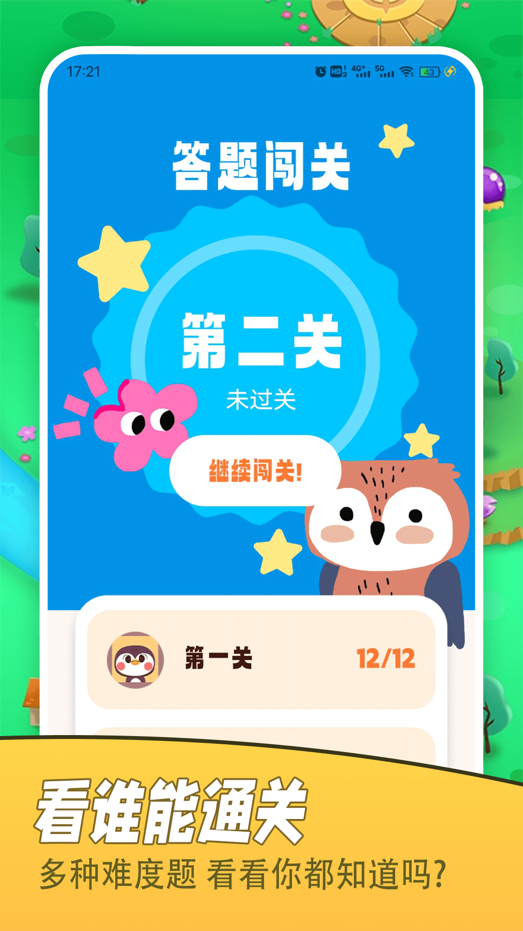 《看誰能通關》是一款兼具挑戰性與趣味性的益智游戲,它借助多樣化的題庫與挑戰環節,助力玩家提升知識儲備與應對問題的能力。游戲以生活里的各類難題為核心展開,玩家既能在輕松愉悅的氛圍中獲取知識,又能通過持續挑戰增強思維能力與反應速度。不管是備戰公務員考試、學習新的知識內容,還是和朋友比拼較量,這款游戲都能為你提供豐富的學習資源以及趣味十足的互動體驗。