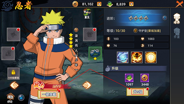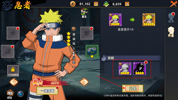 星級(jí)進(jìn)階規(guī)則:當(dāng)收集到足夠數(shù)量的忍者卡牌時(shí),即可完成星級(jí)突破。提升星級(jí)后,不僅能解鎖全新技能,還能獲得額外的屬性加成,從而讓忍者的強(qiáng)度得到顯著提升。