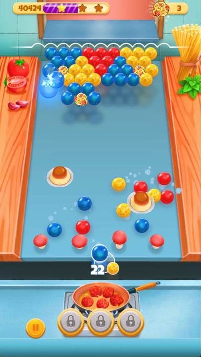 運用墻壁反彈的技巧來避開障礙物,準確命中懸浮在角落處的稀有食材泡泡。