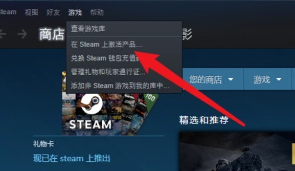 在Steam客戶端的左上角找到“游戲”選項并點擊,接著于彈出的下拉菜單里選擇“在Steam上激活產品”這一選項。