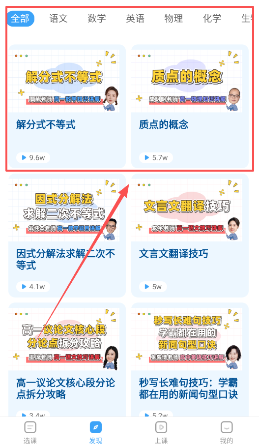 其次,在發現頁面,你可以瀏覽所有科目,也能按語文、數學等類別篩選查看熱門內容,像解分式不等式的講解、質點概念的相關視頻都能找到。
