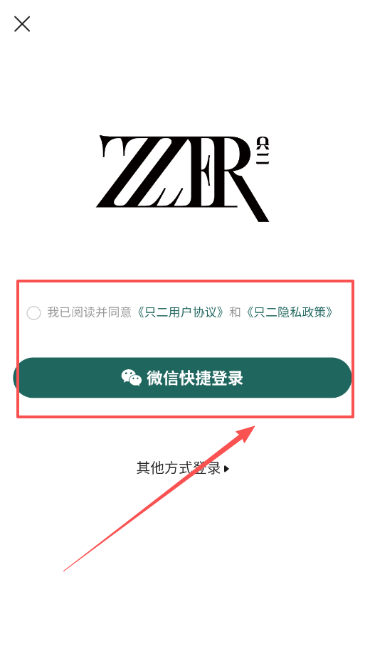 首先打開只二APP,在登錄界面選擇微信快捷登錄方式,勾選同意用戶協議與隱私政策后,就能完成一鍵授權操作。