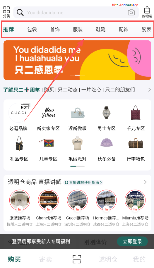 如果您有購物需求,不妨瀏覽首頁的必逛品牌區,這里設有男士專區、千元專區等分類板塊;頁面底部支持隨時切換購買、寄賣、透明倉等功能頁面。
