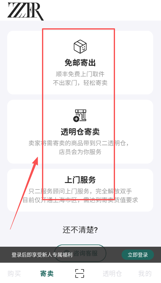 在寄賣頁面可以看到三種操作方式:免郵順豐上門取件是最省心的選擇,透明倉模式需要您親自將商品送至線下門店,也可以先登錄賬號咨詢客服后再進行后續操作。