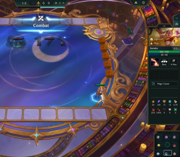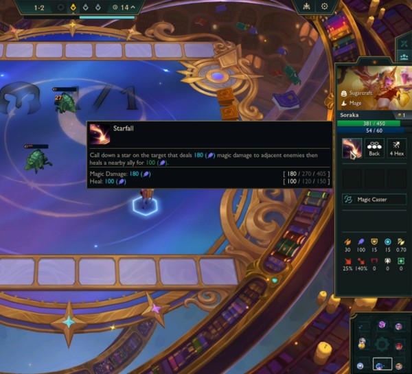 在這里,您能看到單位的協(xié)同效應(yīng)、生命值/法力值、花費、等級、能力詳情(懸停查看)以及裝備物品(同樣支持懸停查看)。