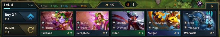 在下圖中,我們能看到有兩只1星的莉莉婭,其中一只處于替補席。這時商店里會出現(xiàn)第三個莉莉婭,它會被特別標注出來,以此提示購買這個莉莉婭后,就能把這三只莉莉婭合成為一只2星的莉莉婭。