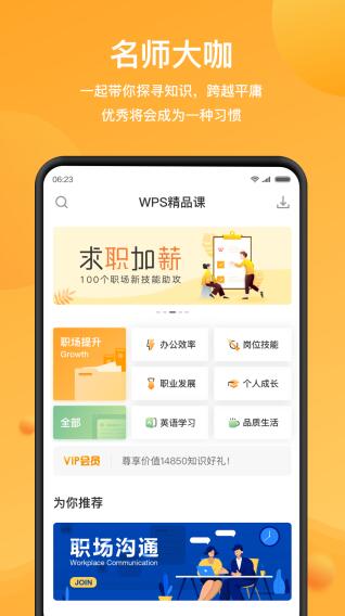 《WPS精品課》是一款專注于為職場人士打造的優質內容學習軟件,涵蓋豐富全面的知識點,提供各類職場專業課程。它致力于為每一位職場人提供高效實用的學習方法,助力解決工作中的各類難題。平臺精選200多門精品課程,由資深名師帶隊授課,用戶可利用碎片化時間隨時隨地學習,輕松提升專業技能。
