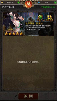 在游戲開局階段,我覺得不用設置太多復雜的要求,只要有一位傳說品質的內政金幣英雄就足夠了。畢竟前期金幣資源十分關鍵,所以建議優先購買離線掛機功能。