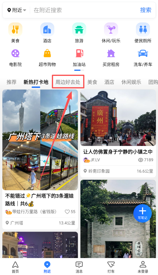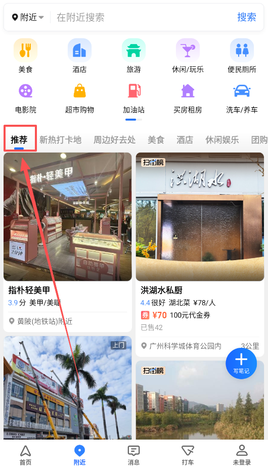 查找周邊服務(wù)時(shí),進(jìn)入附近頁(yè)面,電影院、加油站等各類(lèi)生活需求都匯聚在這里,直接點(diǎn)選所需類(lèi)別,就能快速找到目標(biāo)。