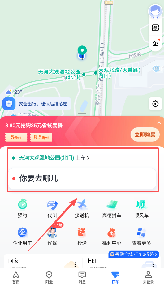 規(guī)劃行程時(shí),在打車(chē)界面輸入起點(diǎn)與終點(diǎn),高德會(huì)給出從實(shí)時(shí)打車(chē)到企業(yè)用車(chē)等多種選項(xiàng),你可以依據(jù)人數(shù)和預(yù)算來(lái)挑選。