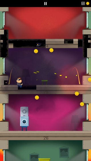 每一層樓的設計都各有獨特之處,房間里擺放著冰箱、沙發、電視這類日常家具。這些看似平常的物品,或許會成為你逃脫時的助力,也可能化作阻礙你前行的障礙。玩家要靈活借助這些家具和電器的破壞力,持續突破關卡以獲取更高分數。而且,部分樓層還藏有機關陷阱與保安巡邏點,稍有疏忽就可能被抓住,所以必須謹慎應對。另外,游戲里還提供了多種風格的裝扮、道具以及能力強化系統,通過收集金幣來解鎖和升級技能,幫助你在冒險中走得更遠!