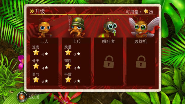 游戲里有工人、士兵、噴吐者和轟炸機這四種螞蟻類型,通關關卡后能得到星星獎勵,這些星星可以用來增強各類螞蟻的能力和屬性。