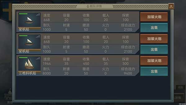 進入“艦隊詳情”頁面,能查看所有戰(zhàn)艦的相關(guān)信息,還可以進行加裝火炮的操作,也支持一鍵出售;而在“造船廠”里,玩家能夠使用金幣來打造更高級別的艦只。