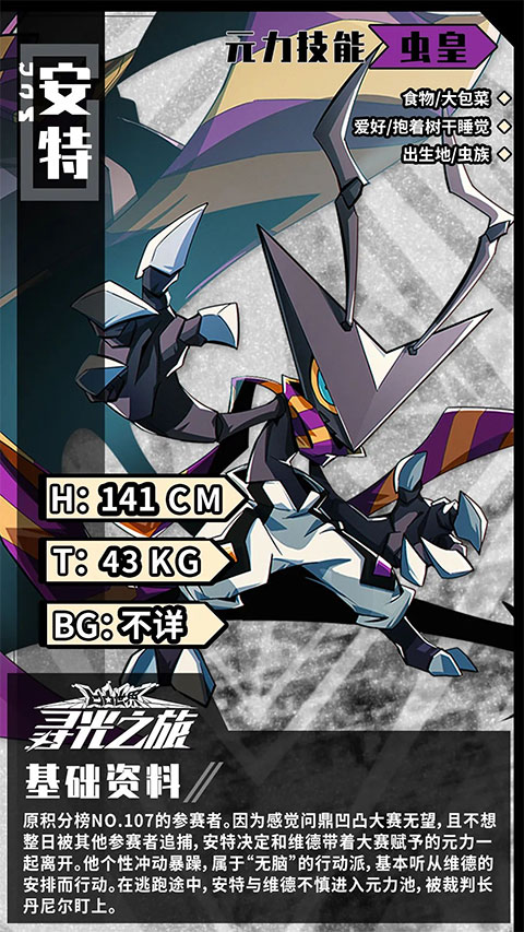 安特原本是積分榜排名第107位的選手。由于覺得奪冠無望,同時(shí)也厭倦了被其他選手圍追堵截的處境,他決定和維德一起帶著元力離開賽場(chǎng)。安特性格沖動(dòng),容易發(fā)怒,是個(gè)行動(dòng)力很強(qiáng)的人,平時(shí)大多聽從維德的安排。不過在逃亡的路上,他們意外闖進(jìn)了元力池,還遭到了裁判長(zhǎng)丹尼爾的追捕。