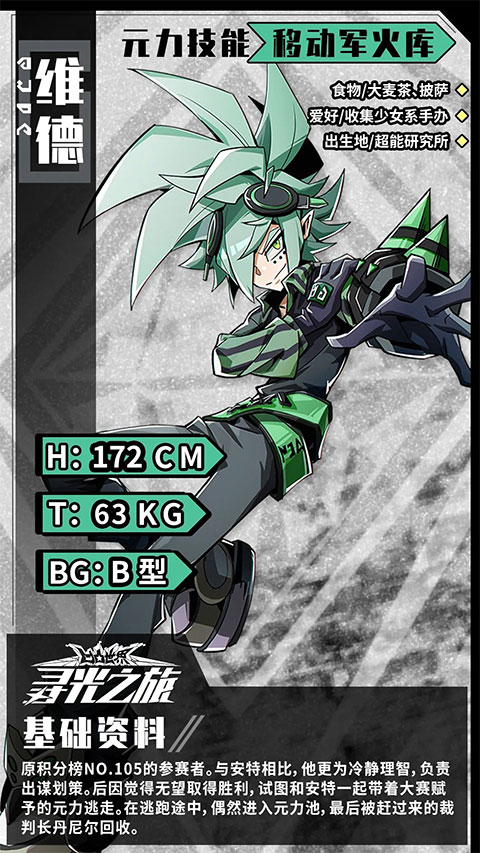 維德曾在積分榜上排名第105位。和隊(duì)友安特相比,他性格更為冷靜理智,主要負(fù)責(zé)隊(duì)伍的戰(zhàn)略制定工作。由于對(duì)贏得比賽逐漸失去信心,他和安特計(jì)劃帶著大賽賦予的元力逃離賽場(chǎng)。然而在逃亡途中,兩人意外闖入了元力池,最終被裁判長(zhǎng)丹尼爾追捕并回收。