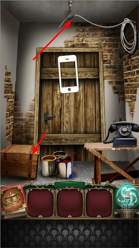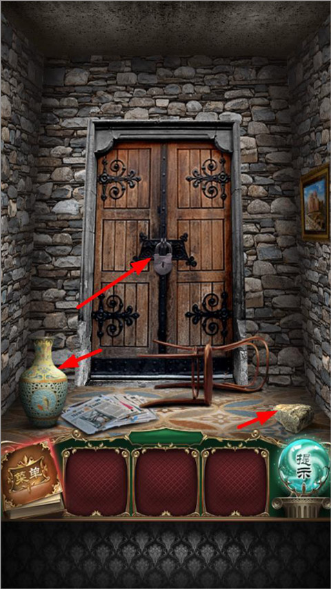 第二關(guān)不再有提示,我們先撿起右側(cè)的石頭,砸破左邊的花瓶,獲取鑰匙后用它打開大門,接著進(jìn)入第三關(guān)。